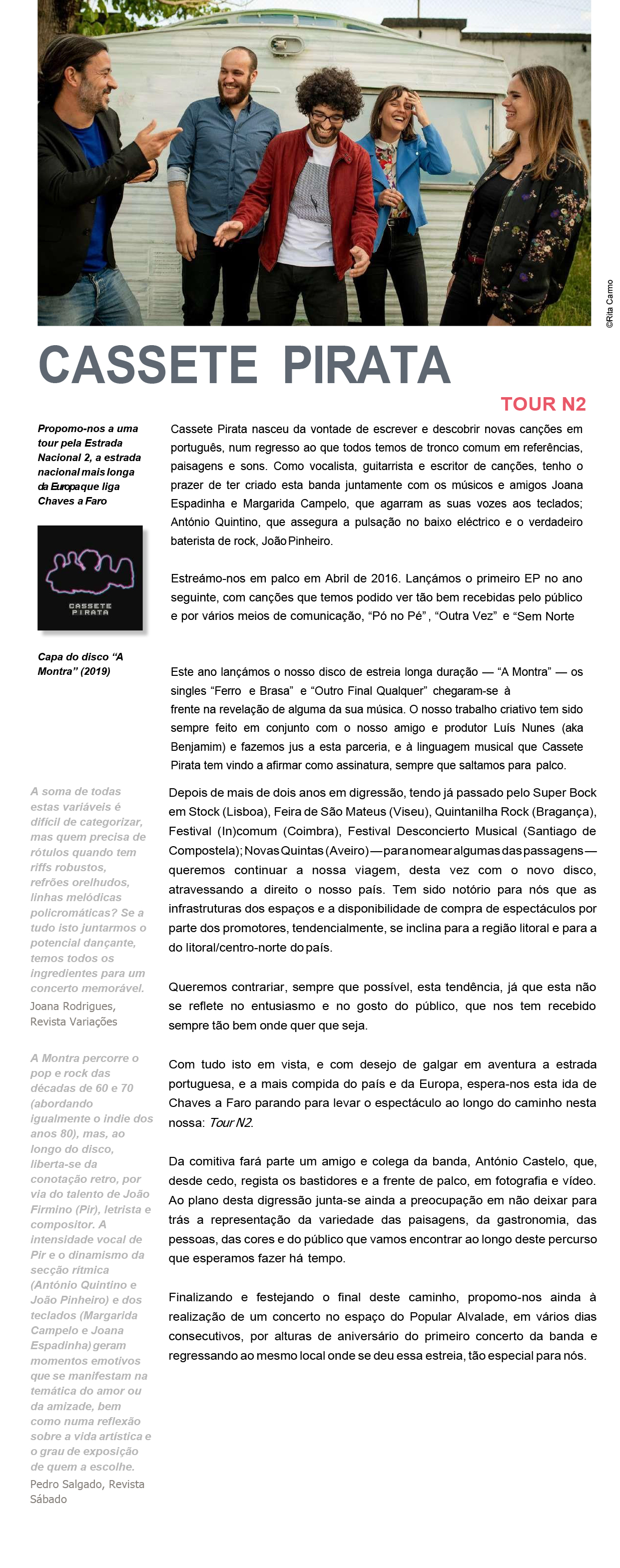 No fundo, este disco é o resultado orgânico, por vezes mais moroso e sinuoso, mas sempre rico e deslumbrante de como é (sobre)viver como banda, como artistas, como personalidades íntegras, neste jogo onde estamos agora a entrar. Este é o nosso primeiro disco, é a nossa primeira Montra.” Diz-nos João Firmino (Pir), que encabeça, encabelando, os Cassete Pirata.